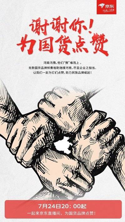 7月24日晚20:00,京东直播打造“谢谢你,为国货点赞”直播专场,给这些经营“尚有困难”但不忘驰援灾区的国货品牌打call。鸿星尔克、贵人鸟、汇源、花西子、完美日记、薇诺娜等国货品牌都在直播间亮相,与网友互动。