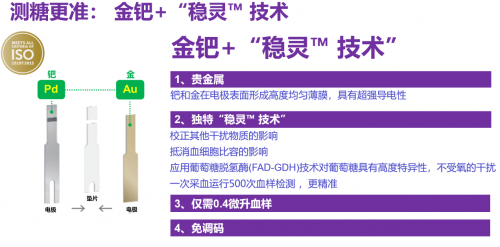 同时在测量结果方面,稳捷血糖仪(原强生血糖仪)测量结果也是非常准确,是测糖实验室级别精准的测糖仪器。它采用独特的金钯+“稳灵? 技术,钯和金在电极表面形成高度均匀薄膜,具有超强导电性,校正其他干扰物质的影响,抵消血细胞比容的影响,应用葡萄糖脱氢酶(FAD-GDH)技术对葡萄糖具有高度特异性,不受氧的干扰,一次采血运行500次血样检测 ,更精准。同时稳捷血糖仪(原强生血糖仪)的测量标准极其的高,已经被国际认证机构(德凯)所认证,完全符合ISO15197: 2013标准。