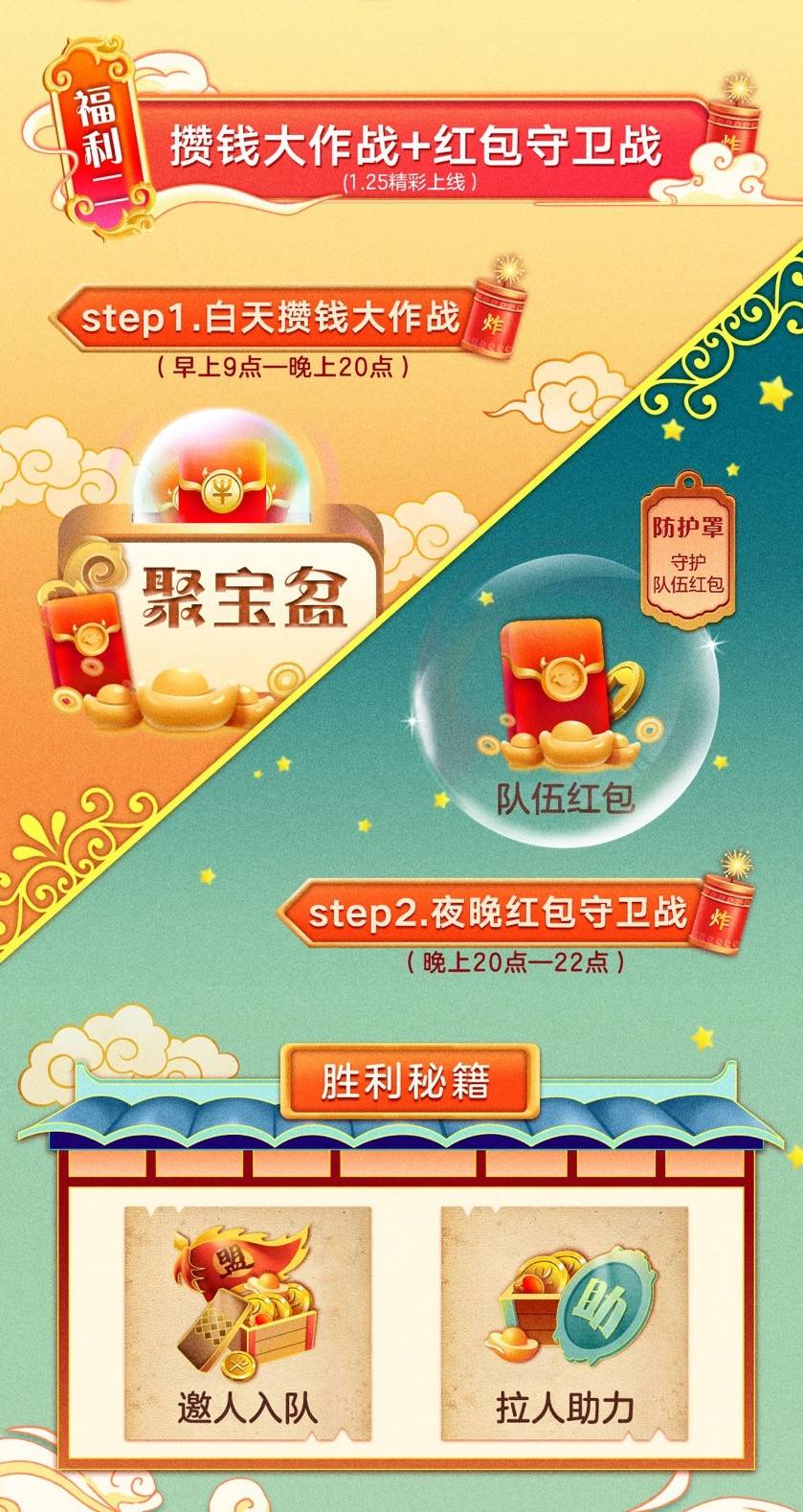 支线玩法“白天攒钱大作战,晚上红包守卫战”,从1月25日开始,每天早9点到晚8点,用户通过邀请好友组队、邀请好友助力、做任务等方式完成系统自动下发的攒钱“目标金额”,赢取相应的团队红包奖励。到了晚上8点至10点,用户则要开启防御模式,同样通过直接登录游戏、邀人进队、邀请助力等方式提升自身防御罩的“防御值”,防止红包被其他团队偷走。当然,用户也可以主动出击偷取别人的红包。
