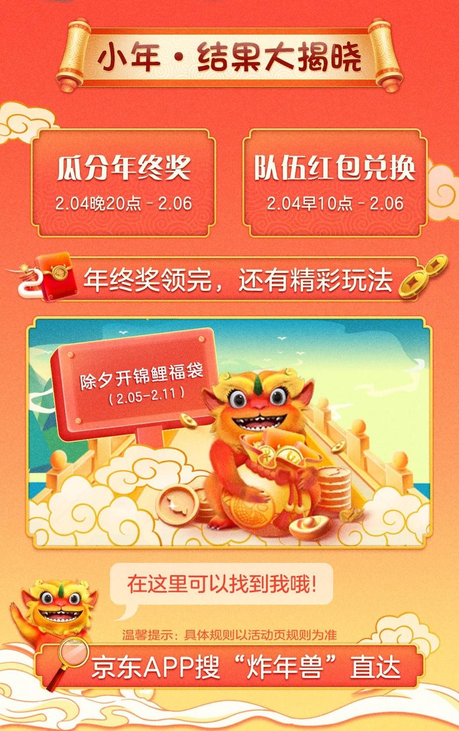 最终所得红包将在2月4日至2月6日兑换,小年夜之后,用户还能继续闯关,全部通关的用户可以抽取除夕锦鲤福袋。