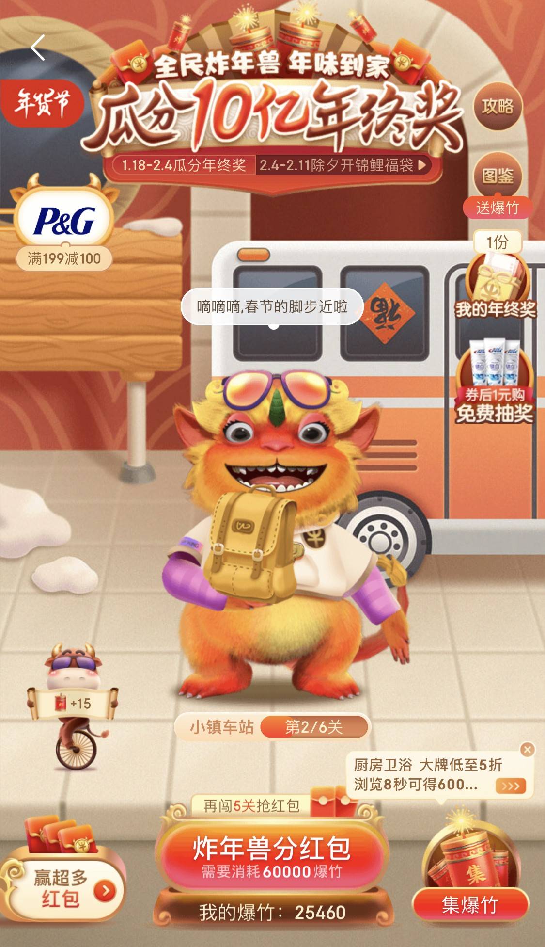 主线玩法“全民炸年兽 闯关分红包抽大奖”,共设置有三十个小关卡,用户闯关收集爆竹炸年兽,每闯一关将获得一定份额的年终奖用来瓜分奖励,挑战成功的关卡越多,瓜分时有机会获得更大金额,而在成功闯关过程中还有机会获得红包奖励。而收集爆竹的方式,除了玩AR小游戏之外,大家可通过每日登录、浏览店铺、浏览会场、逛商品、逛互动、逛视频&直播等方式收集爆竹,邀请好友助力也能获得相应爆竹。