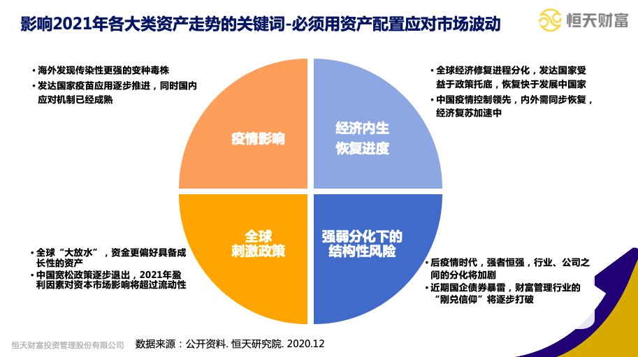 在分享的第一个板块,刘可从风险的突发性与资产配置的重要性入手,提出了影响2021年各大类资产走势的关键词。