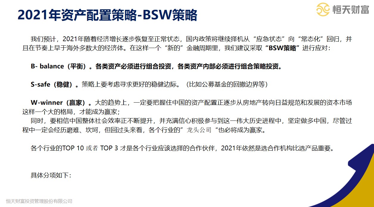 刘可预计,2021年随着经济增长逐步恢复至正常状态,国内政策将继续择机从“应急状态”向“常态化”回归,并且在节奏上早于海外多数大的经济体。在这样一个“新的”金融周期里,恒天财富研究院建议采取“BSW策略”进行应对: