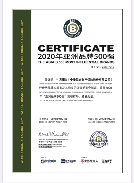 世界品牌实验室从2004年起每年发布中国500最具价值品牌,从2006年开始每年发布亚洲品牌500强。据了解,中华财险已经连续14年入围中国500最具价值品牌,连续三年入选亚洲品牌500强,品牌价值逐年递增,市场竞争力和消费者满意度也在逐年提高。34年来,中华财险始终践行“服务至上、信守承诺、回报社会”的服务宗旨,勇于承担社会责任,得到了社会各界的广泛认可。