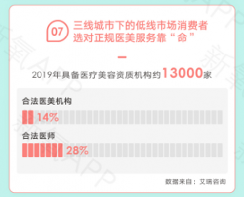 近日,新氧数据颜究院与每经智库·未来商业研究中心共同出品的《2020医美行业白皮书》(以下简称“白皮书”)正式发布,对三线城市下的低线市场医美消费现状进行了详细解读。据艾瑞咨询数据显示,2019年中国具备医疗美容资质的机构约13000家,合法医美机构仅占行业14%,合法合规医美机构仅占行业12%,合法医师仅占行业28%。