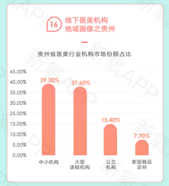 在贵州省医美行业的机构份额占比中,中小机构的市场份额占比最高为39.3%,大型连锁机构、公立机构和新型精品诊所的市场份额占比分别为37.6%、15.4%和7.7%。这其中的隐忧在于,当地医美市场鱼龙混杂,存在技术不发达、服务质量差等问题。较为明显的体现是,曾因虚假广告盛行,当地政府一度严控广审证(医疗广告审查证明)办理。