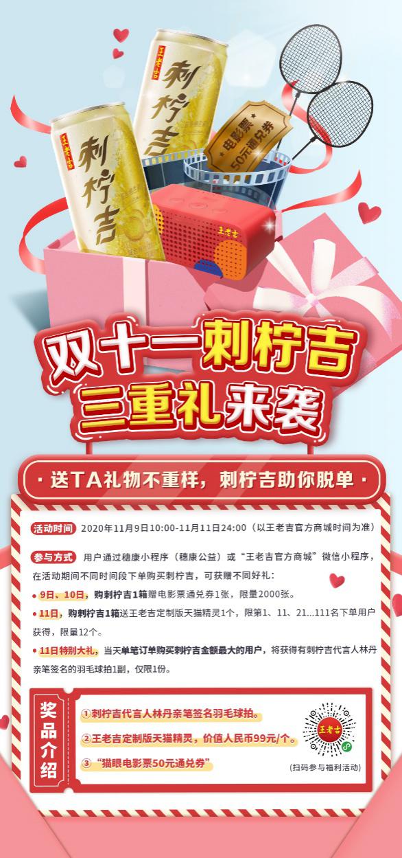 在11月9日10点至11日24点(以王老吉官方商城时间为准),用户通过穗康小程序(穗康公益)或“王老吉官方商城”微信小程序,在活动期间下单购买刺柠吉饮料,将有机会获赠不同好礼:9日-10日,用户购买刺柠吉饮料1箱,赠送50元电影票通兑券1张,限量2000张;11日,购刺柠吉1箱送王老吉定制版天猫精灵1个,限第1、11、21...111名下单用户获得,限量12个;11日更有特别大礼,当天单笔订单购买刺柠吉金额最大的用户,将获得有刺柠吉代言人林丹亲笔签名的羽毛球拍1副,仅限1份。每个用户可重复下单参与活动从而获赠不同礼品,活动期间每日可参与活动10次(具体细则见活动页面)。