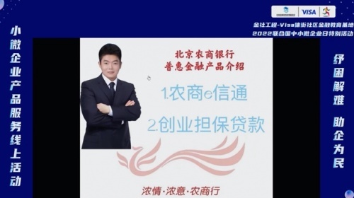 为切实帮助小微企业渡过当下难关,提升小微企业生存空间,同时也为了庆祝到来的“2022联合国中小微企业日”,6月27日,金社工程-Visa体街社区金融教育基地举行“纾困解难 助企为民”小微企业产品服务线上活动。活动得到中国工商银行、中国农业银行、中国银行、交通银行、招商银行、浦发银行、平安银行、北京银行、北京农商银行等多家单位的参与。丰富的小微企业贷款产品、专业的产品讲解,给小微企业主们带来切实的帮助。此次活动由中国金融教育发展基金会与Visa共同策划,基地枢纽运营机构——西席文化联合创始人袁文阳担任主播,此次活动邀请到平安银行北京分行中小企业客群战略发展部总经理李坚担任主播嘉宾。