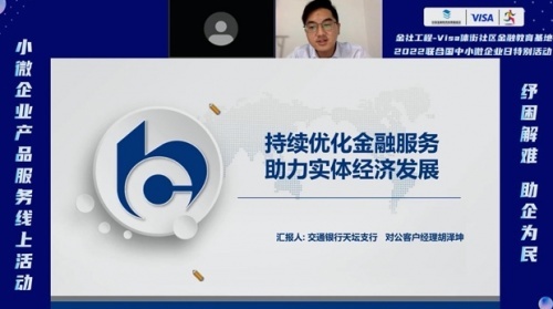 连麦的第四位嘉宾是交通银行天坛支行对公客户经理胡泽坤,胡老师介绍了交通银行现在的对于小微企业的减费让利政策,并且为小微企业主带来了交通银行的产品“普惠E贷”,包括申请方式及要求,向企业主展示交通银行的优惠政策。