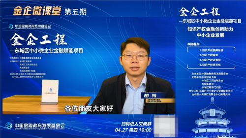 4月27日(周四)晚7:00,“金企微课堂”第五期活动顺利开展,主办方邀请到北京智慧财富集团、北京中金浩资产评估有限责任公司北京运营中心总经理,中知在线联合创始人胡钊老师,带领大家就“知识产权金融创新助力中小企业发展”相关问题展开深入探讨。