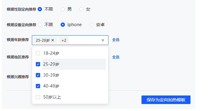 提供多类目种定向组合工具,涵盖基础属性、消费偏好、设备特征等维度。用户通过"25-40岁+iOS用户+知识付费行为"定向策略,实现获客成本下降58%。
