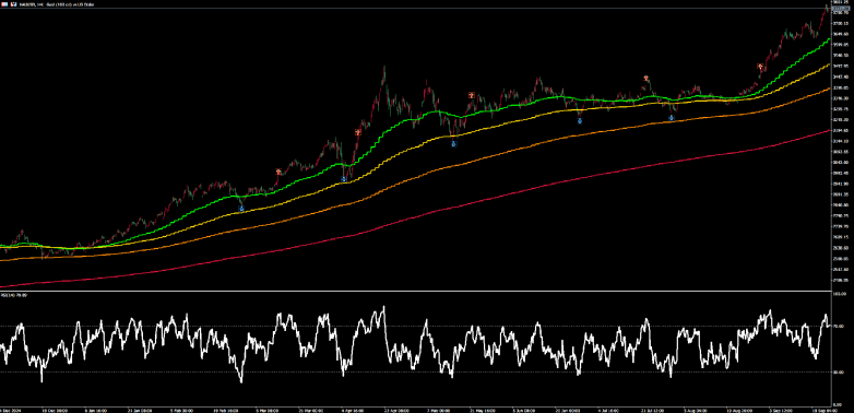 (1)MTF_MA(20)>MTF_MA(50)>MTF_MA(100)>MTF_MA(200) (2)RSI(14)<30,代表行情来到相对低点