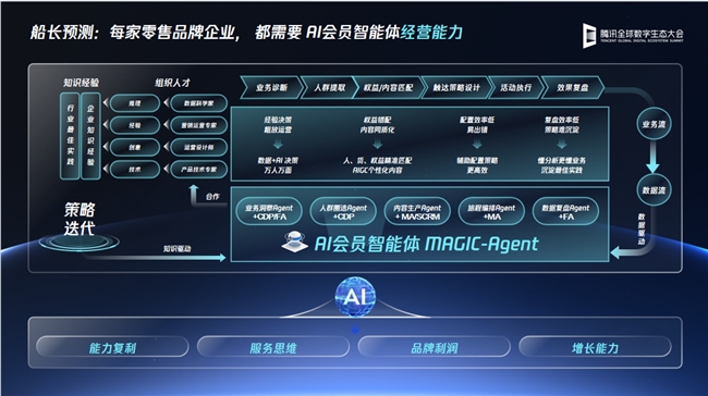 升级后的“AI会员智能体”将复杂的会员经营流程重塑为标准步骤,并打造了人群洞察、权益设计、智能选品、个性化内容、数据自动复盘5大子Agent,首次实现了多智能体协作的全智能化。企业营销人员仅需通过“对话式”的自然语言输入目标,智能体便能自动完成从策略制定到效果分析的全过程。覆盖业务诊断、人群提取、权益/内容匹配、触达策略设计、活动执行、效果复盘等环节,真正将企业的会员库从“消费数据”升级为可运营、可增值的“会员资产”,可实现“万人万面”的精准服务。最重要的是“AI会员智能体”每天都在自我进化,聪明的智能体吸引更多用户,更多用户沉淀更多私有数据/知识积累,从而进化成为更强的智能体,形成AI数智飞轮效应,成为业绩的持续增长驱动力。