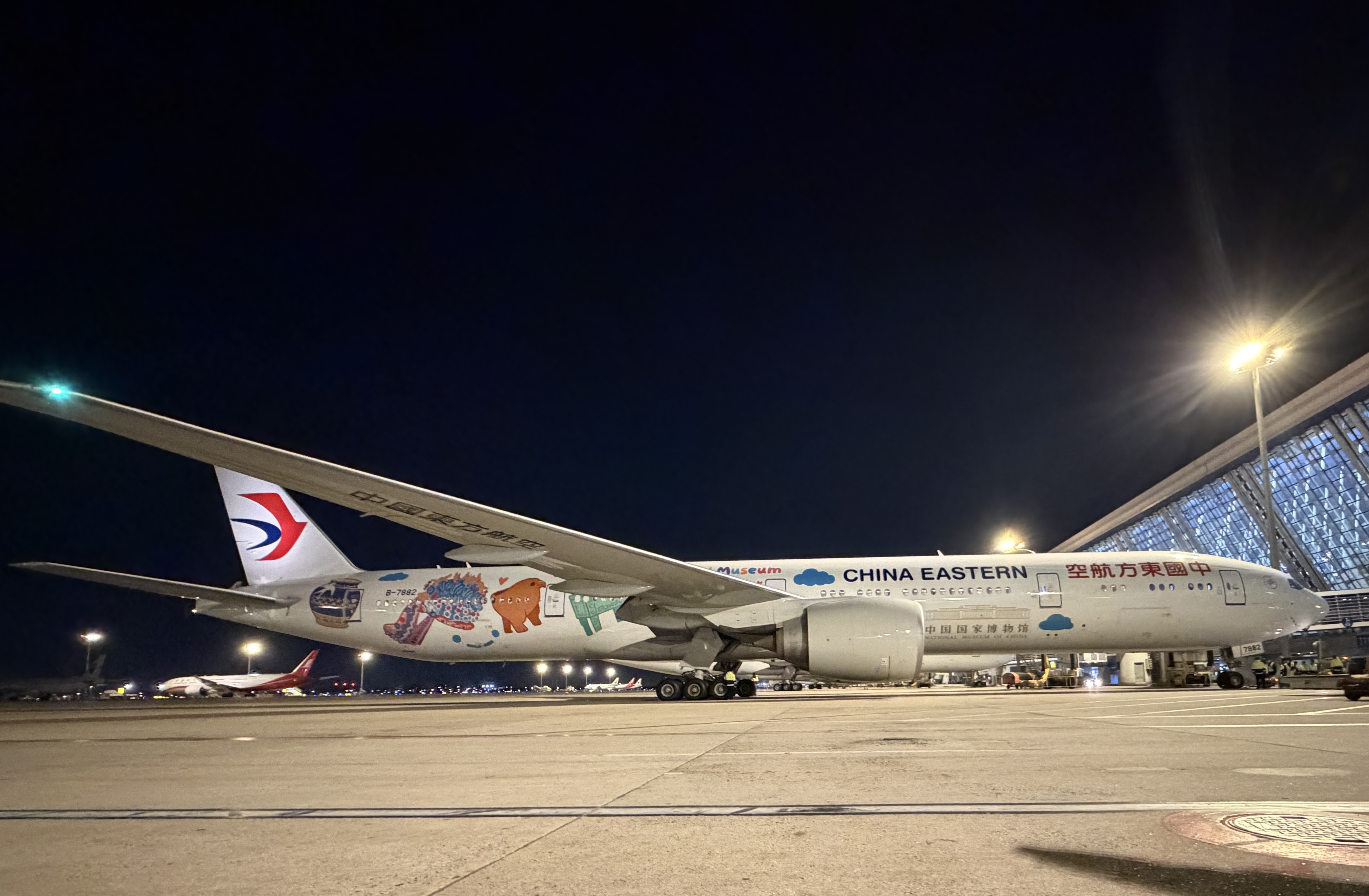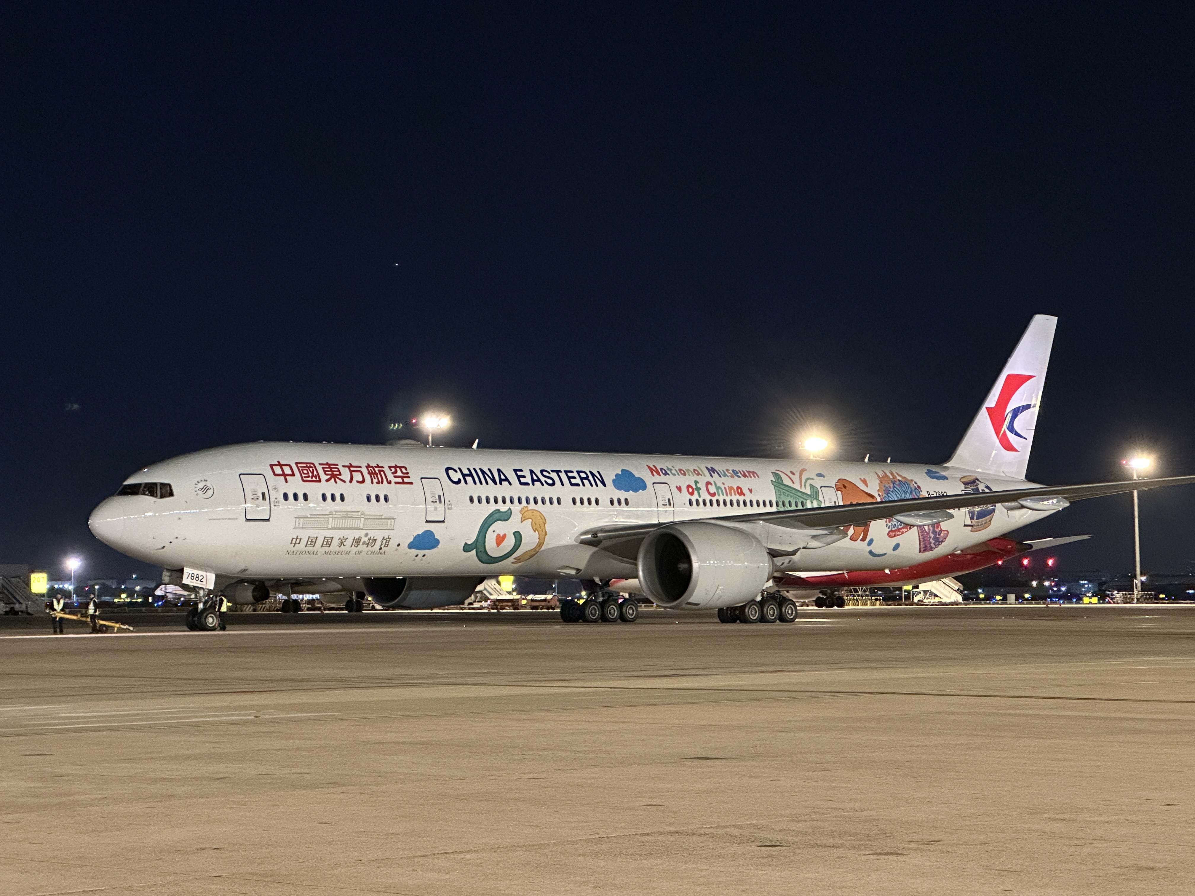 此次首航航班,东航特别选用“国博号”主题彩绘机执飞。这架彩绘机基于波音777-300ER大型宽体客机打造,由中国东航与中国国家博物馆联袂设计,于今年9月正式亮相,被誉为是国博48个标准展厅之外的 “第49个展厅”,承载着满满的中华文化元素。
