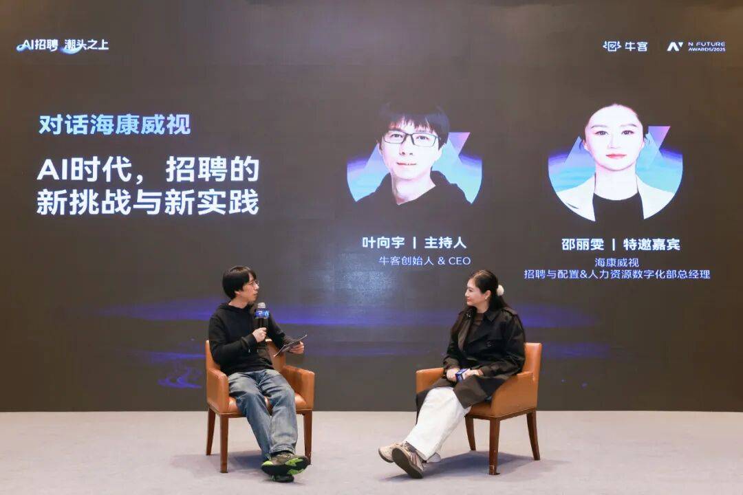 在圆桌对话环节,牛客创始人兼CEO叶向宇与海康威视招聘与配置&人力资源数字化部总经理邵丽雯,围绕“AI时代下,招聘的新挑战与新实践”展开了轻松、深入的交流。邵丽雯分享了海康威视引入AI面试的实践过程:考虑到蓝领人员流动相对较高、招聘需求量较大的实际情况,团队选择岗位标准清晰的职位先行试点,最终顺利实现了招聘流程的标准化,也有效提升了招聘面试过程的效率。
