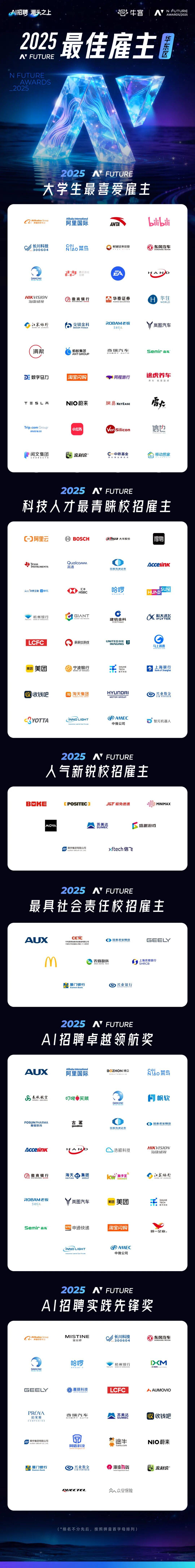 盛典隆重揭晓了“2025NFuture最佳雇主(华东区)”获奖名单。本次设立大学生最喜爱雇主、科技人才最青睐校招雇主、人气新锐校招雇主、最具社会责任校招雇主、AI招聘卓越领航奖、AI招聘实践先锋奖六大奖项。
