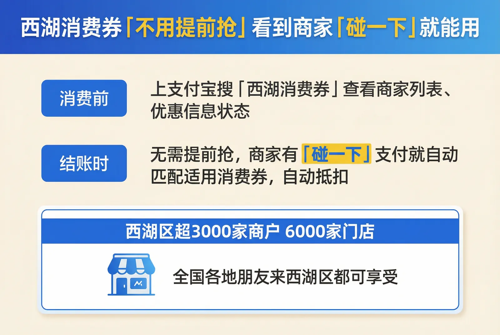 不用抢、直接用,“西湖模式”以创新设计激活消费潜力。这一将数字技术与民生需求深度结合的新模式,正为杭州消费市场搭建全新 “快车道”,随着更多区域接入,将持续释放内需增长新动能。
