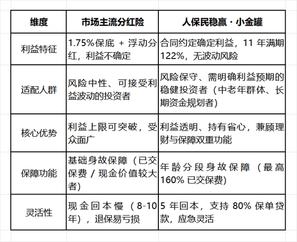 值得关注的是,中国人保寿险在当下市场环境中推出“民稳赢・小金罐”两全保险。该产品以“11年满期利益122%写入合同、无浮动风险、确定领取”作为差异化定位,这一举措打破了分红险领域同质化竞争的局面。