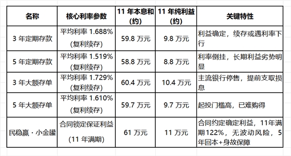 融360数字科技研究院2025年9月的监测数据显示,3年期整存整取平均利率为1.688%,而5年期整存整取平均利率为1.519%;大额存单方面,3年期平均利率为1.729%,5年期平均利率为1.610%。基于融 360 最新监测利率,以 50 万元本金、11 年持有期为标准,按“到期续存”(储蓄类产品)和“合同约定保证利益”(以中国人保APP上的民稳赢・小金罐为例)原则测算,利益如下(注:银行产品假设未来利率维持当前水平,民稳赢・小金罐按合同约定保证利益核算)。