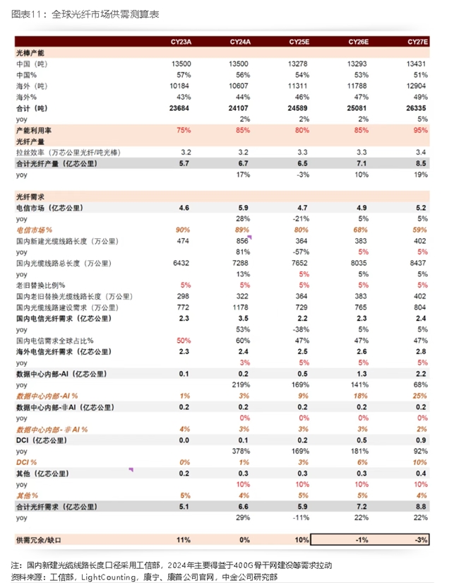 供给端,光棒产能扩产周期通常在2年及以上,叠加历史上电信市场的大幅降价,光棒长尾产能出清,在位厂商近年来扩产决策相对谨慎,供给呈现相对刚性,整体竞争格局较为稳定。我们判断当前全球光棒产能在2.5万吨左右,而光棒扩产周期在2年及以上,我们预计至2027年全球光棒产能增长至2.6万吨左右,结合稼动率、拉丝效率的提升,对应光纤年供应能力达到约8.5亿芯公里,或将低于年需求量。