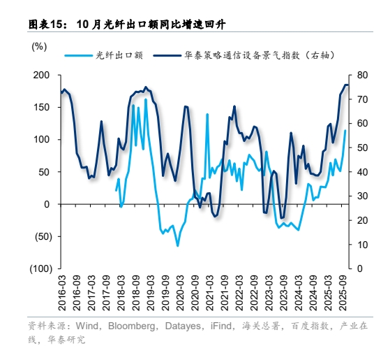 光纤出口额增速与通信设备景气指数在长期内保持高度协同,尤其是在2025年初同步显著上扬。这主要得益于全球数字化进程加速,5G网络、数据中心等新基建投资在海外市场进入密集落地期,推动我国光纤光缆海外需求持续增长,印证了行业整体景气度正稳步提升。截止2025年10 月光纤出口额同比+113.8%,较 9 月(+74.4%)回升。