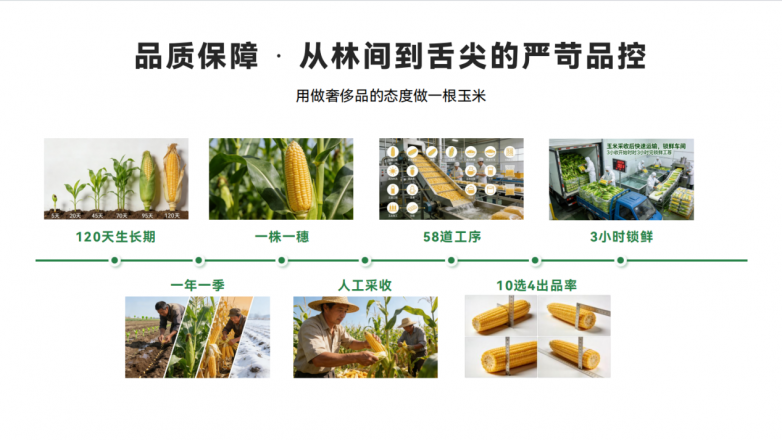 工艺品质的严苛把控,是森林友机产品口碑的核心保障。品牌坚守“像选钻石一样选玉米”的准则,建立了从种植到出厂的全链条精细化管理:采用人工采收方式,避免机械损伤导致的作物残损;遵循“一年一季、120天生长期”的自然规律,拒绝催熟干预;采用“一株一穗”的生产管理标准,确保每根玉米都能充分汲取养分;采摘后3小时内完成锁鲜入袋,最大程度保留食材的鲜度与营养;历经58道工序层层筛选,最终实现10选4的严选出品率,剔除任何不符合标准的产品。更值得信赖的是,品牌建立了透明可追溯的生产体系,每袋/箱产品均附有有机追溯码,让消费者看得见每一份产品的来路。