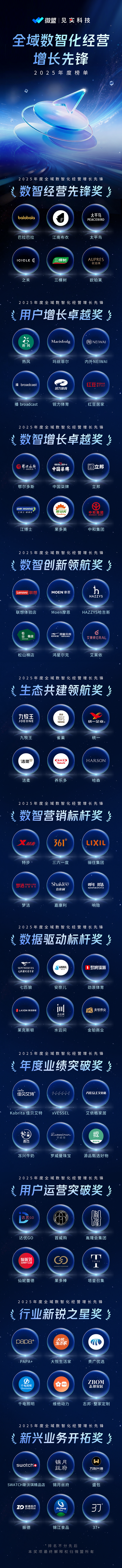 在此背景下,微盟联合见实科技发起「2025年度全域数智化经营增长先锋」 评选,聚焦数智经营、全域增长、生态共建三大核心维度,通过多轮资格审核、专家评审与实效验证,从海量品牌实践中挖掘出真正将趋势转化为增长动能的标杆品牌。本次评选不仅旨在表彰行业先锋,更致力于提炼可复制的增长范式,为零售行业高质量发展提供参考坐标系,共同定义下一阶段经营价值基准。