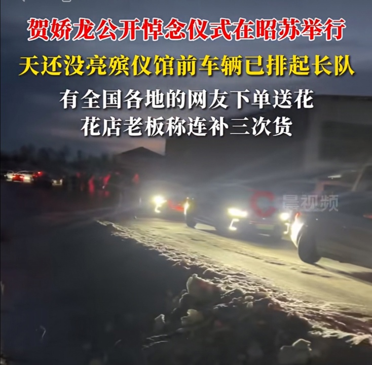 1月16日,贺娇龙公开悼念仪式在当地殡仪馆举行。上午9时许,新疆的天还没亮,殡仪馆前的车辆已有数公里长。