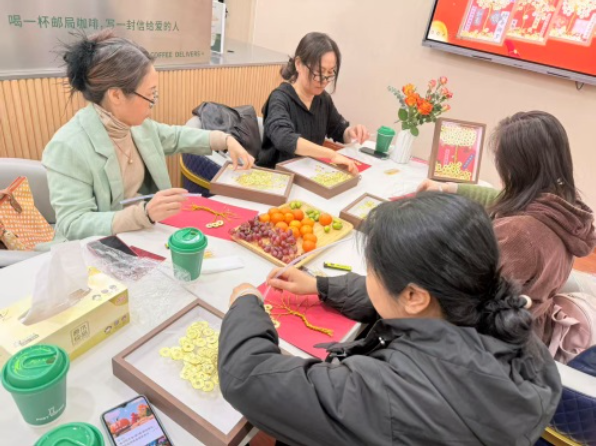 活动现场,工作人员备好金灿灿的铜钱挂饰、红色卡纸与精致挂绳,无需任何手工基础,跟着老师的指引,就能将一片片“金叶”错落串起,让铜钱在金色绳间垂坠成摇曳的财运。同时,工作人员为客户们准备了暖心咖啡及鲜果茶点,客户不仅能制作独属于自己的新春手作,更能在咖啡香与欢笑声中,结识志同道合的朋友。在做手工的同时,客户有的与邻座伙伴交流理财心得,有的与公司销售伙伴沟通新年保障规划,在轻松愉悦的氛围里,把财运与保障一同握在手中。
