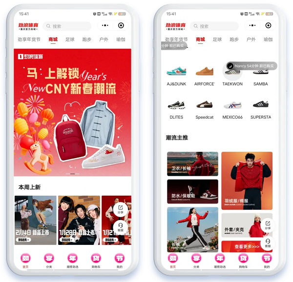 劲浪体育顺势推出“导购专属服务+小程序全品类供给”的组合策略,私域转化效率大幅提升。数据显示,合作后私域年GMV近9000万元,同比增长43%;导购单人可管理用户规模显著扩大,人效提升让一线运营聚焦更加精准的用户运营。