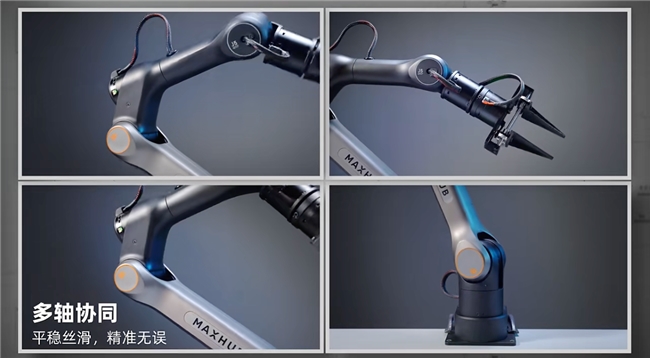 宣传片显示,MAXHUB A3机械臂整机采用一体化设计,自重仅5.5KG,单人即可轻松完成“即插即用”部署,大幅降低了工业自动化的入场门槛。