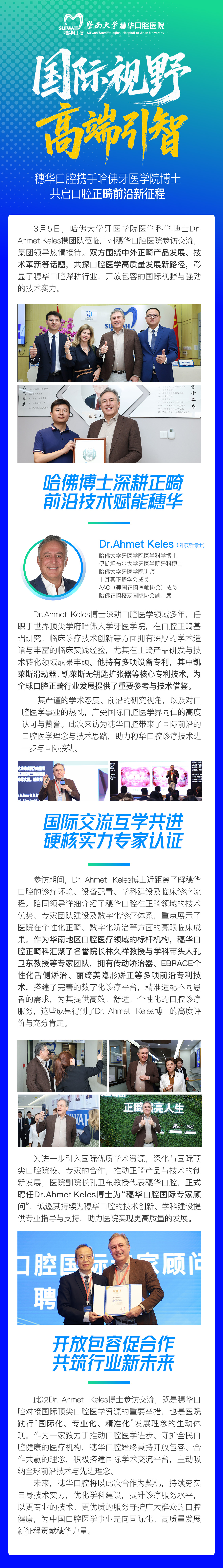 3 月 5 日,哈佛大学牙医学院医学科学博士 Dr.Ahmet Keles 携团队莅临广州穗华口腔医院参访交流,集团领导热情接待。双方围绕中外正畸产品发展、技术革新等话题,共探口腔医学高质量发展新路径,彰显了穗华口腔深耕行业、开放包容的国际视野与强劲的技术实力。