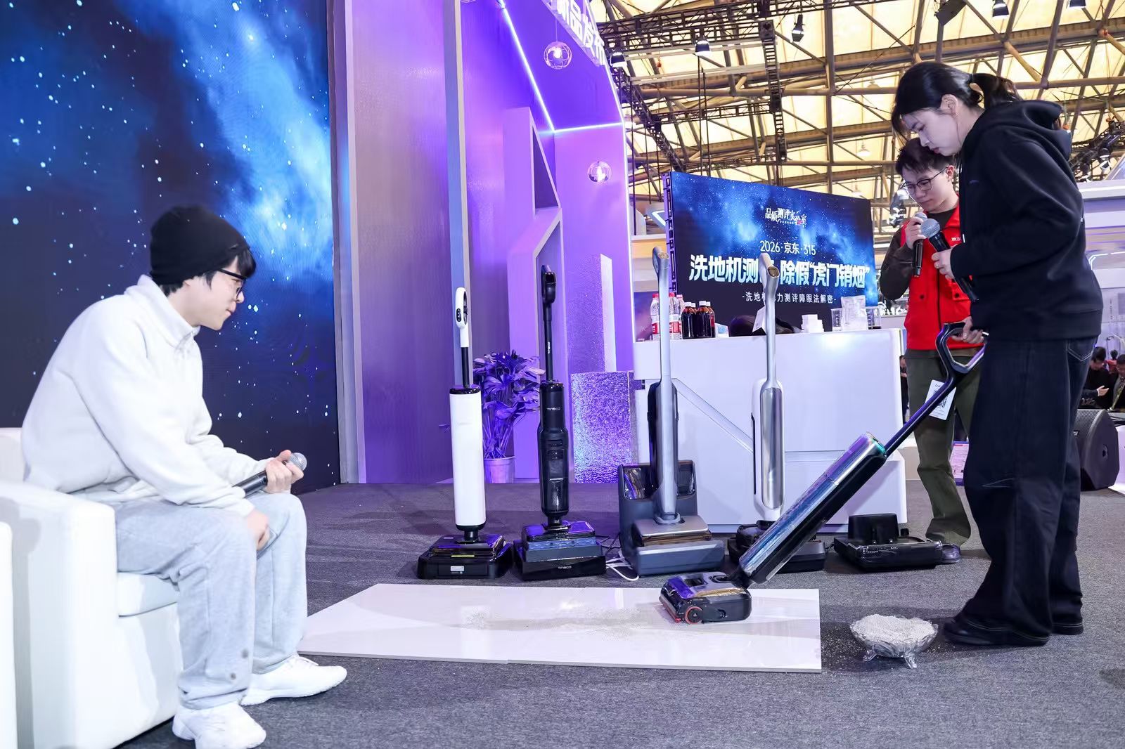 面对如此伤害消费者的行业乱象,京东决定主动出击,一方面联手云鲸、添可、追觅、uwant、小米等洗地机品牌,现场揭穿某些直播机构如何通过“技术处理”制造性能假象,集体发声抵制虚假测评对行业生态的侵蚀;另一方面京东还在AWE现场发起“百人测评”活动,邀请参会观众真机测评、综合打分,选出更符合自身使用习惯和清洁需求的洗地机产品,向大众分享测评心得。