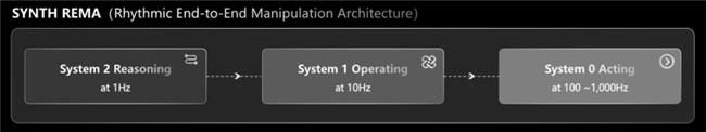 • 深思 · 执行 (SYNAction) :面向操作智能的专属模型架构,章鱼动力首创REMA分频多尺度端到端操作架构,在统一模型中通过三层闭环完成从认知到执行:System 2(低频)负责任务理解、认知推理与高层规划,System 1(中频)负责动作策略生成、衔接认知与执行,System 0(高频)负责底层控制与精细交互执行,助力机器人高效完成复杂操作、实现全流程执行闭环。