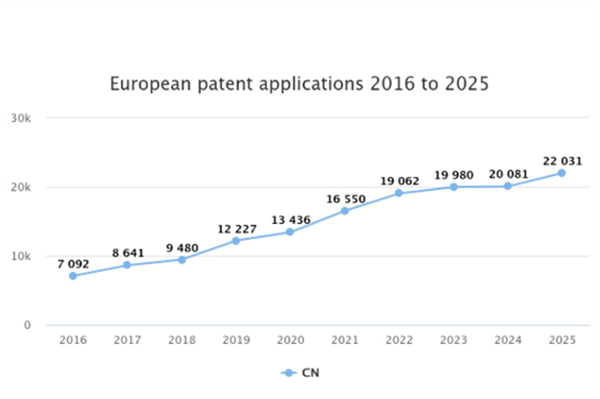 • 2025年,欧洲专利局受理来自中国的专利申请达22,031件,较2024年增长9.7%