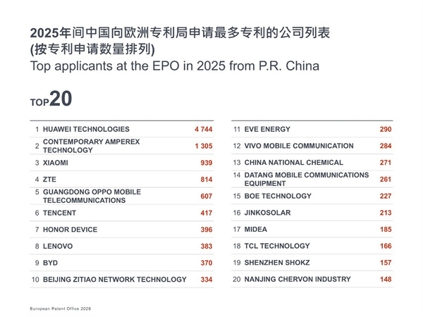 中国领军企业表现:首次两家中国企业跻身EPO企业申请榜前十