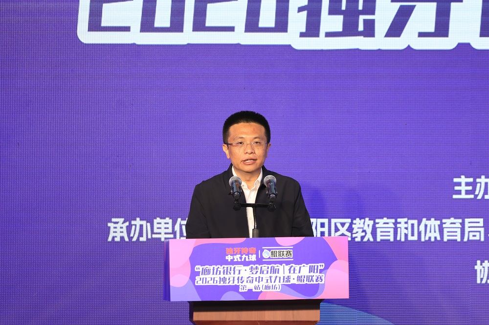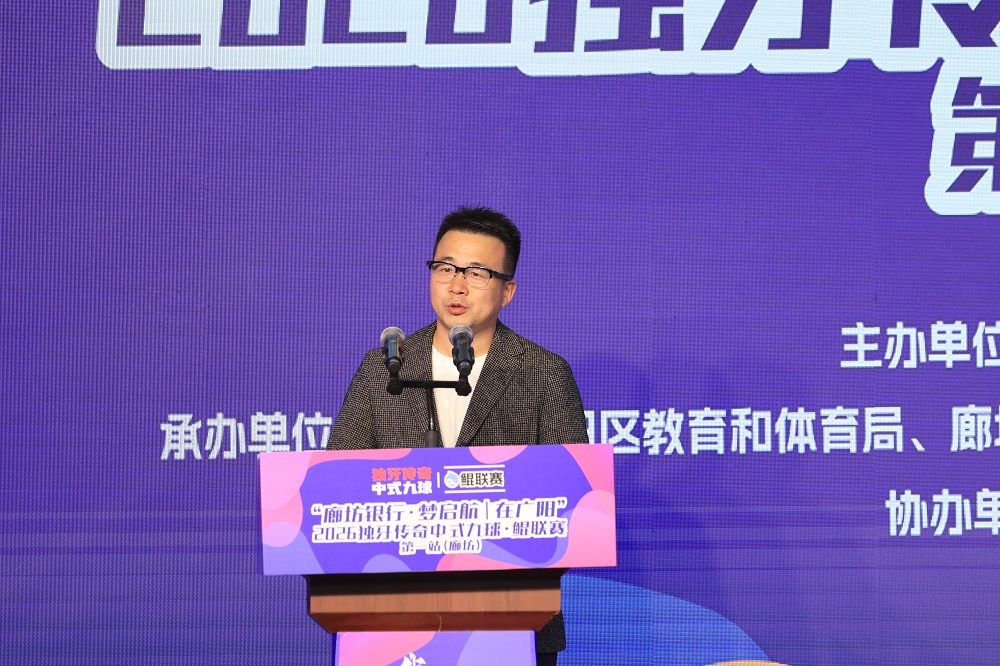 在致辞环节,独牙控股集团董事长乔冰率先登台讲话。他代表独牙台球集团向远道而来的青少年球员及家长致以最热烈的欢迎,向廊坊市广阳区人民政府、廊坊市体育局及廊坊银行等各合作单位致以感谢,特别感谢廊坊市广阳区人民政府对鲲联赛的大力支持与悉心指导。他表示,赛事以“鲲”为名,寄寓鹏程万里之志,致力于打造属于青少年自己的顶级中式九球赛事IP,为健康中国与体育强国建设贡献一份力量。同时,乔冰董事长期待以本次赛事为起点,与广阳区深化合作、携手同行,共同书写中国青少年台球的新篇章。