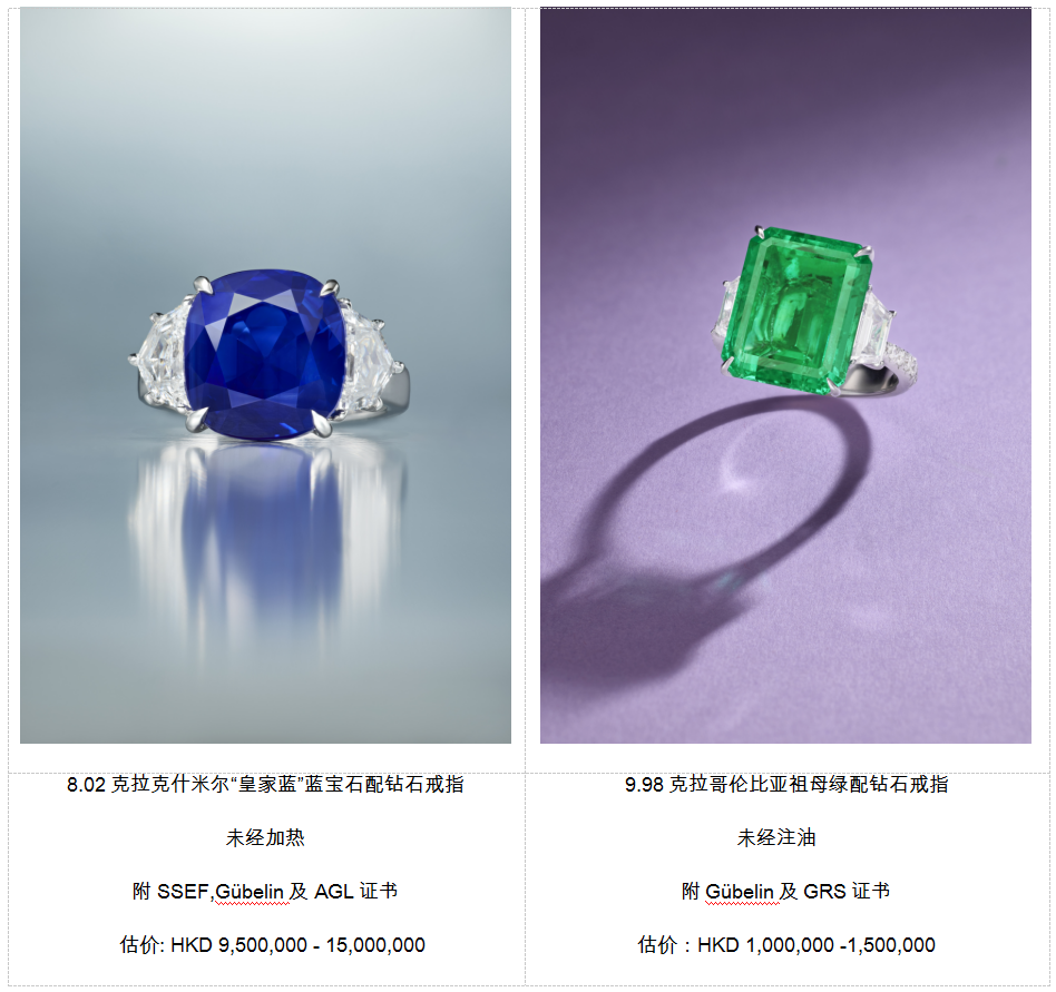 同场亦有一枚9.98克拉哥伦比亚祖母绿配钻石戒指,未经注油,熠熠生辉。这枚戒指以一颗9.98克拉的八边形哥伦比亚祖母绿为主角,其色泽纯正浓郁,晶体澄澈明净,是未经注油处理的珍罕品种,更显其天然本真。主石两侧配镶璀璨钻石,与祖母绿的沉郁翠色相映生辉,展现简约而现代的几何美学。整体线条流畅,既适合日常佩戴,亦具收藏价值。随附Gübelin及GRS两家权威机构证书,为其品质与产地提供了可靠的鉴定依据。
