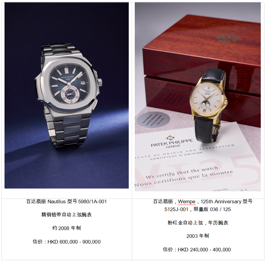 钟表方面,本季拍品将由百达翡丽 Nautilus型号5980/1A-001领衔。该表为精钢计时码表,采用经典的一体式表链设计,线条流畅且佩戴舒适。蓝色表盘饰有垂直磨砂纹理,在光线照射下呈现丰富层次感,布局清晰易读。表盘下方设有分钟累积计时盘与指针式日期显示,兼顾实用功能与视觉平衡。腕表搭载自动上炼机芯,具备日期显示与计时功能,兼顾日常实用性与精准性能。该型号体现了百达翡丽在功能整合与细节工艺上的制表传统。