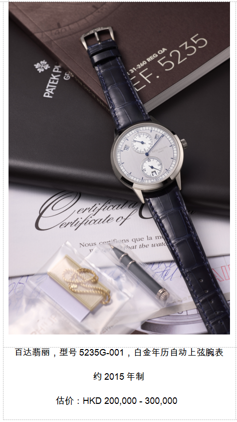 百达翡丽型号5235G-001 白金年历自动上弦腕表,则采用高贵白金材质表壳,搭载品牌精湛的自动上弦年历机芯。其最为独特之处在于“三针一线”(regulator)表盘布局——时、分、秒针各自独立轴心,呈现清晰而复古的视觉秩序,彰显低调而深邃的机械美学。腕表具备实用的年历功能,可自动区分大小月,并设有日期与星期显示,将复杂功能与简约设计完美平衡。此表不仅展现百达翡丽一贯的顶级制表工艺,更以独特表盘结构在品牌年历系列中别树一帜,是藏家不容错过的经典时计。