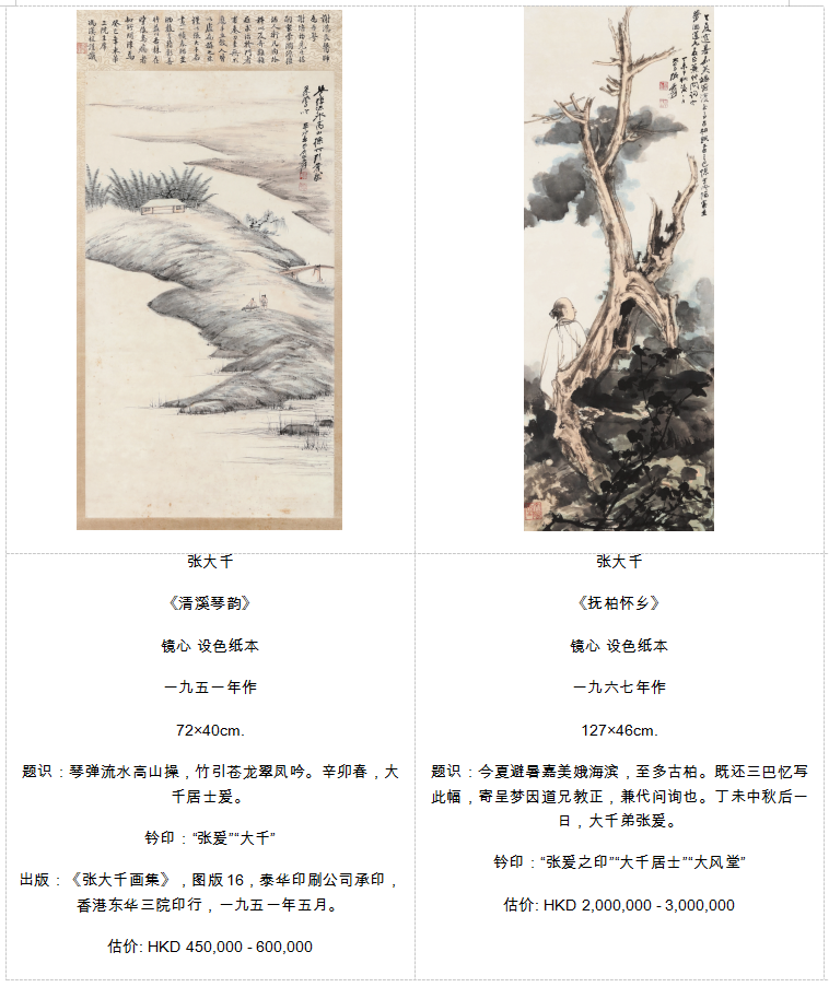张大千《抚柏怀乡》:此作为张大千于 1967年于巴西寄予挚友陈梦因之作。画面近景以赭石、石绿铺底写山石,浓墨绘出黄栌灌木。正中古柏拔地而起,枝干施以淡赭,枯笔勾勒皴擦,树叶则以花青晕染,复以墨色浓淡分阴阳,苍润遒劲,气势夺目。高士衣,线条超逸,行止似驻足、似疾行,正是作者自我投射,寄寓浓浓思乡情愫。此时张大千旅居海外多年,胸中已熔炼中西文化精髓,于贝多芬《第六交响曲》与陶渊明《桃花源记》中汲取灵感,此作可视为张大千与海外华侨一生追寻的精神家园。