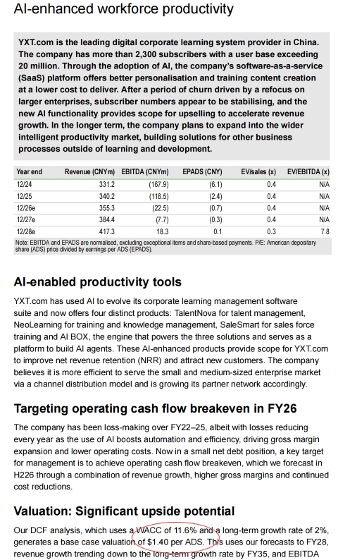 报告指出,以绚星的现金流折现分析(DCF)采用 11.6%的加权平均资本成本(WACC)和 2%的长期增长率,得出每股美国存托股份(ADS)的基本估值为1.40美元。
