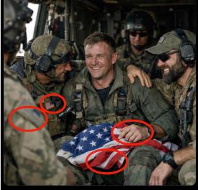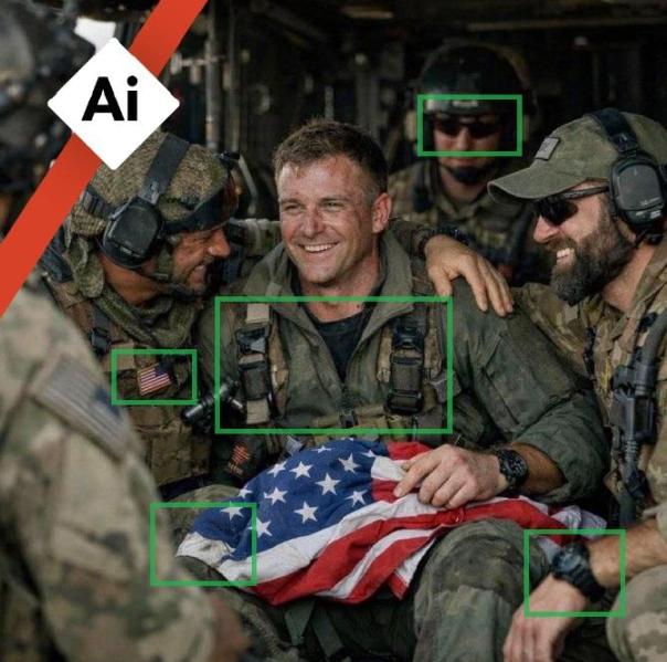法新社也注意到,图片左侧士兵胸前的美国国旗臂章形状和位置不正确。另外一名士兵佩戴的手表也有些畸形,另一人脸上的太阳镜更像是添加上去的。