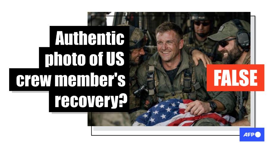 随后,一张被描述为“美国军官手持美国国旗在伊朗获救”的图片在海外互联网广泛传播。图片显示,这名美国军官微笑着手持美国国旗,被营救他的战友簇拥。
