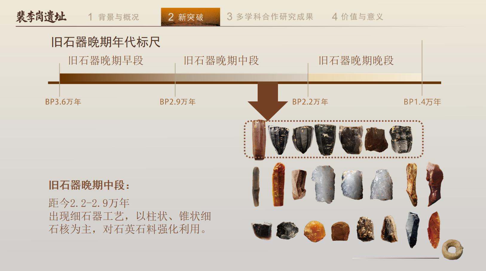 旧石器晚期遗存可划分为三个阶段:早段距今约3.6—2.9万年,以简单小石片石器工艺为主;中段距今约2.9—2.2万年,此阶段开始出现预制细石核,石器加工技术发生显著变化,以柱状、锥状细石核最具代表性;晚段距今约2.2—1.4万年,遗存相对稀疏,不见鸵鸟蛋壳,但堆积连续未见明显中断,以楔形细石核最为典型。