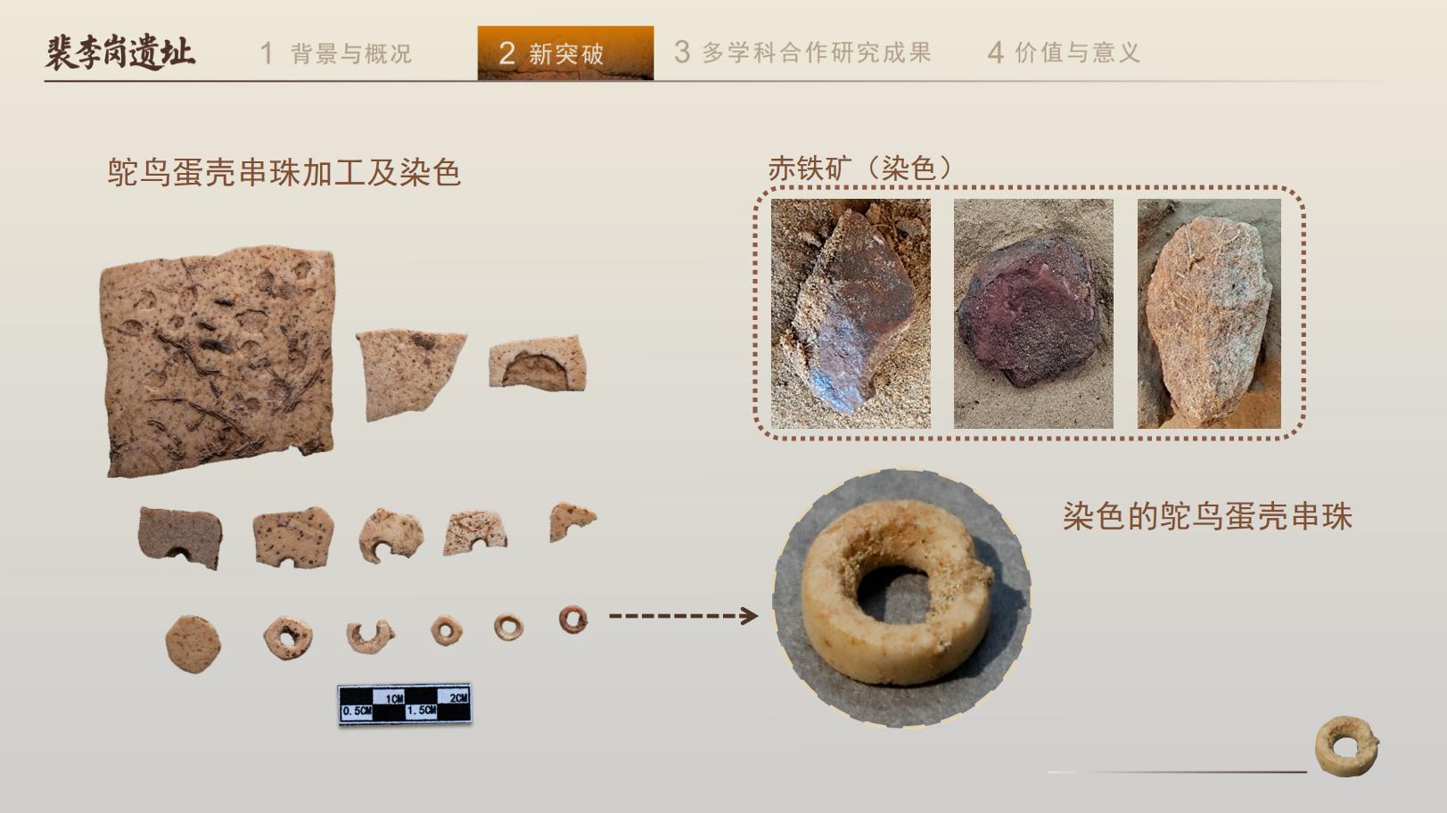 其中,中段遗存堆积最为丰富集中,发现了石器制造场,出土有大量石核及细石叶、石片原地埋藏遗存,以及与用火相关的石制品、炭化骨渣和烧黑的鸵鸟蛋壳。还发现了鸵鸟蛋壳串珠加工场所,相关遗物可复原鸵鸟蛋壳串珠的整个加工流程。该阶段还出现有石磨盘,可被视为是磨制石器之滥觞,显示出定居程度有所增强。