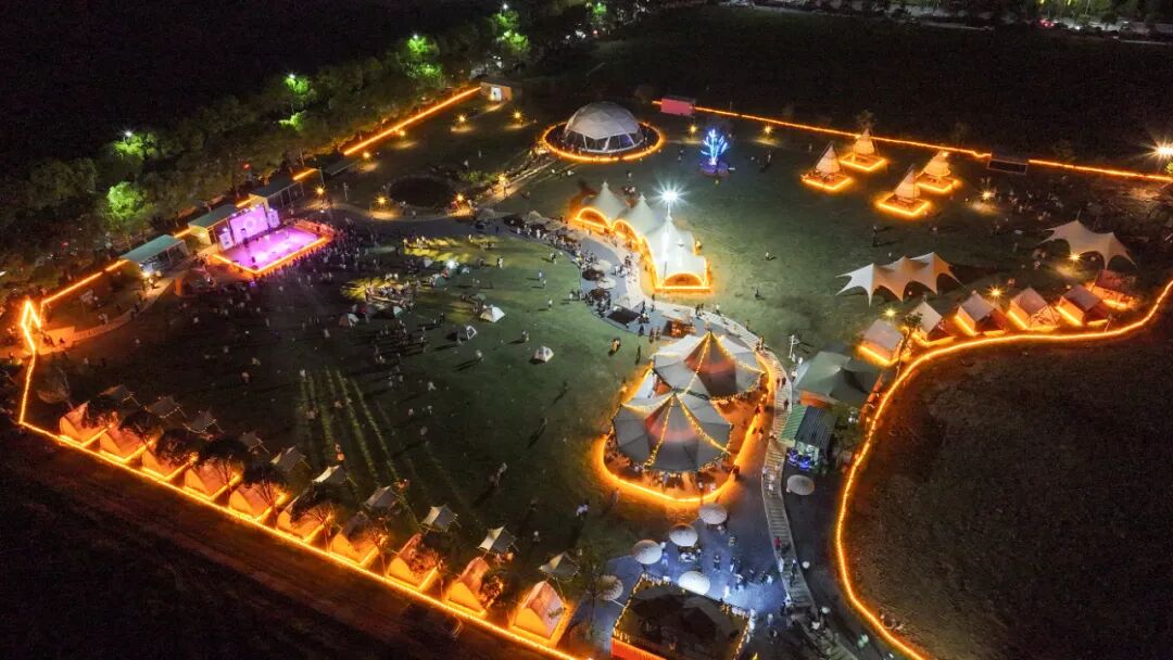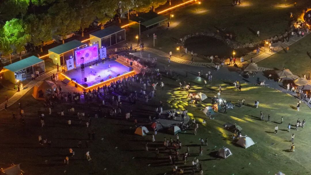 从下午开始甜野牧歌露营地便热闹起来。60顶帐篷在湖畔错落安扎,构成一片温馨的“帐篷部落”。露营者们自备装备,在指定位置安营扎寨。傍晚时分,烧烤摊位上的炭火燃起,香气四溢。人们围坐在一起,品尝着亲手烤制的美食,遥望着芙蓉湖的晚霞。夜幕降临后,露营者们或步行至体育夜市感受人间烟火,或在露天电影的银幕前席地而坐,或遥望音乐节现场的璀璨灯光。湖风轻拂,星光点点,这一夜,青阳的山水与温情,深深印刻在每一位露营者的心中。