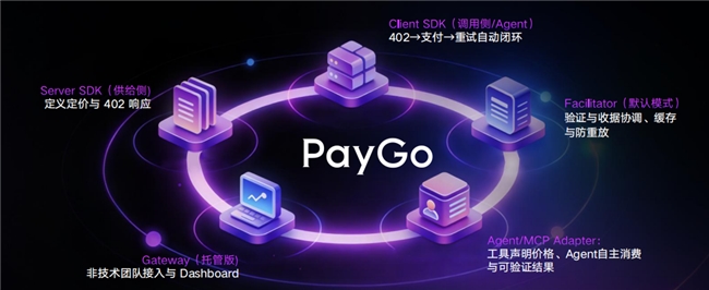 在整体架构上,PayGo 由多个模块化组件构成,具体包括客户端 SDK、服务端 SDK、PayGo 网关、Facilitator 验证层以及 Agent/MCP 适配器。这些组件共同协作,实现报价标准化、凭证验证、防重放处理、自动化支付以及预算管理等相关功能。模块化的结构可以降低接入方的技术成本,无论是开发者还是服务提供方,都可以通过相应组件完成系统对接,实现自身服务的结算与管理。